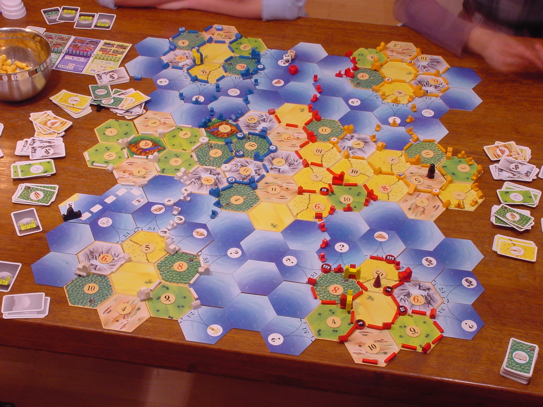 Gerne – und das bedeutete lange Abende – wurde Die Siedler von Catan gespielt. Da konnte der Tisch nicht groß genug sein. Sämtliche damals erhältliche Erweiterungen